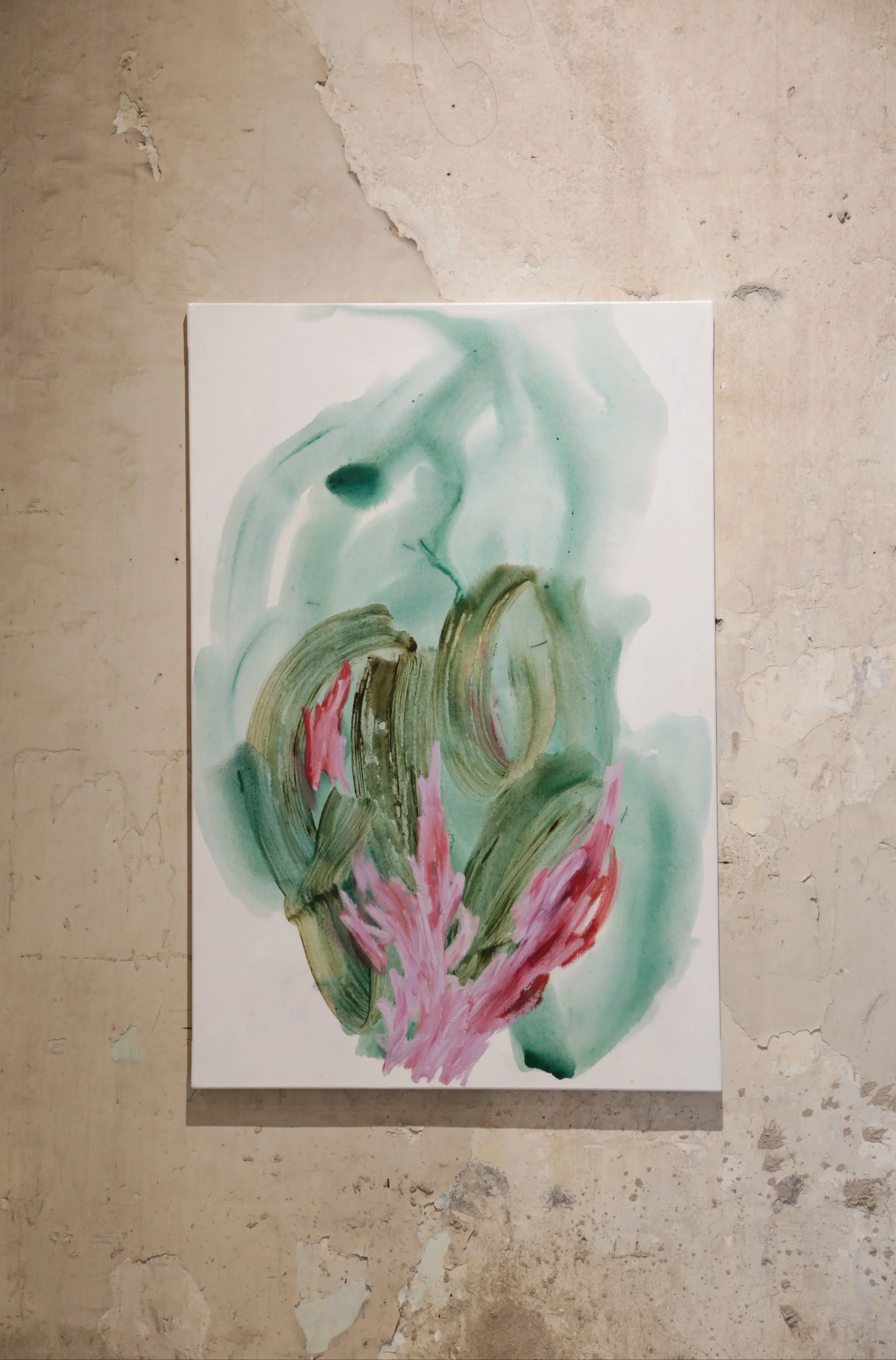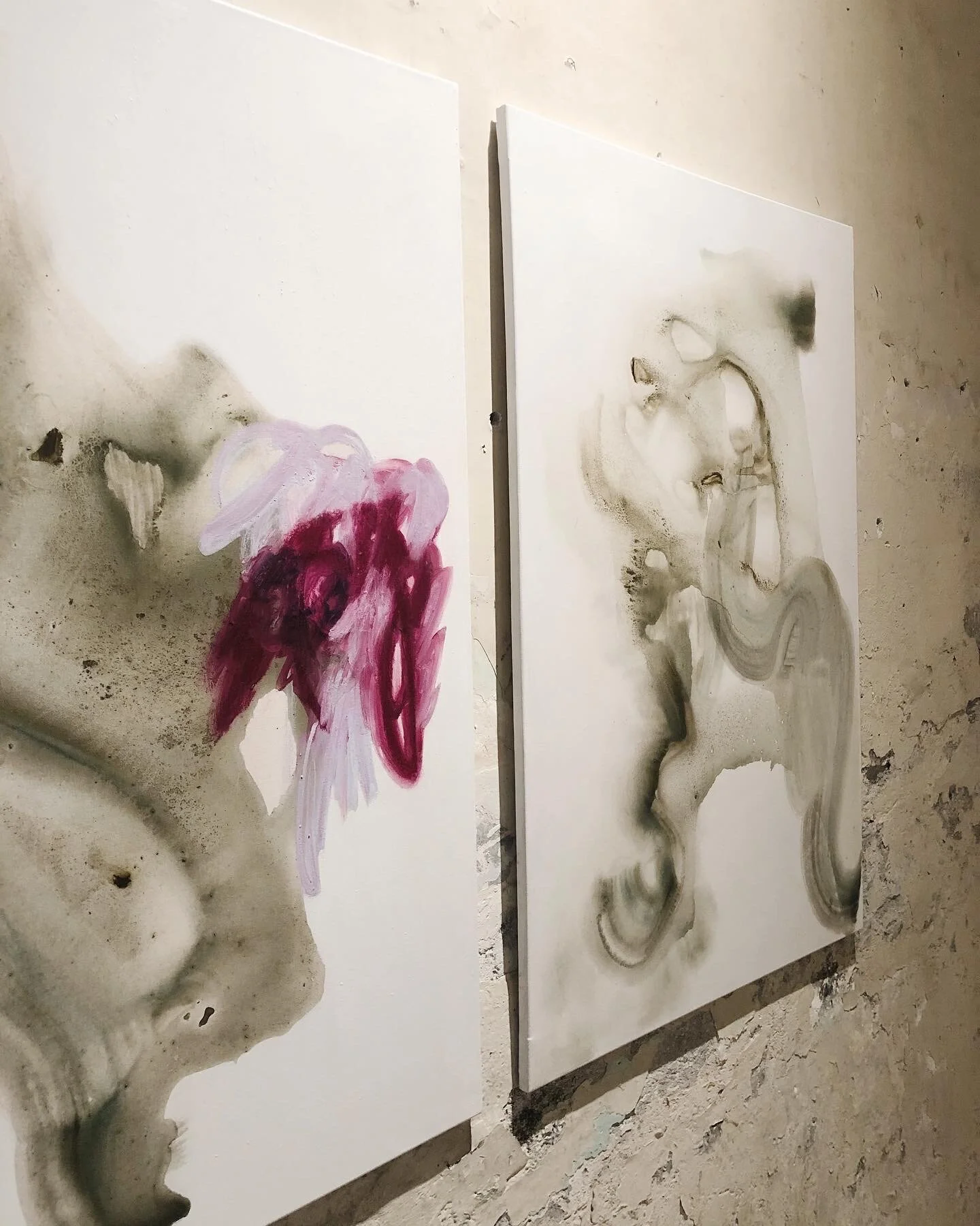 Durante algún tiempo pensé que cuestionar y analizar mis decisiones, formas de expresión y a la vida en general me traería, a través del control, algún ansiado estado de paz. La verdad es que no podía estar más equivocada. Esa búsqueda de control se traducía en mi trabajo como intentos de reproducción mimética de una realidad inasible y para ser sincera, demasiado abstracta para mis esfuerzos por replicarla. Hoy, mi proceso va en otra dirección; deja atrás cualquier pensamiento o acto que busque controlar o sobre analizar lo que sale de mi. Lo único que busco es honestidad con el momento que habito y conmigo misma, desde ahí todo lo demás toma forma.Estas piezas son el resultante de la casualidad y el azar a través del movimiento de mi cuerpo y el material. El resultante entre mi curiosidad e intuición y las alternativas posibles.